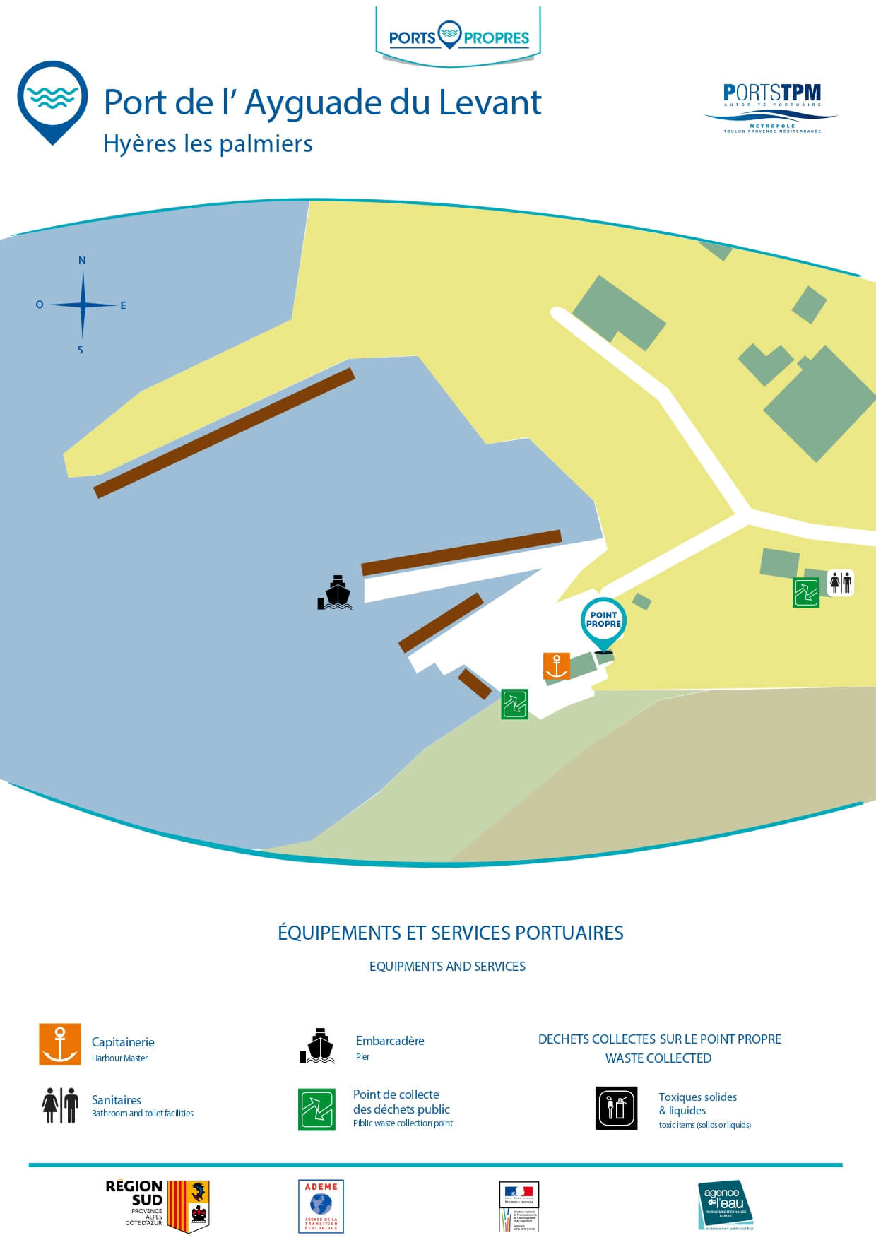 • Le port de l’Ayguade, seul port civil de l’île, exploité en régie par la Métropole Toulon Provence Méditerranée. Il assure la liaison avec le continent, accueille les passagers, réceptionne les marchandises et reçoit les navires de pêche et de plaisance, notamment en période estivale.